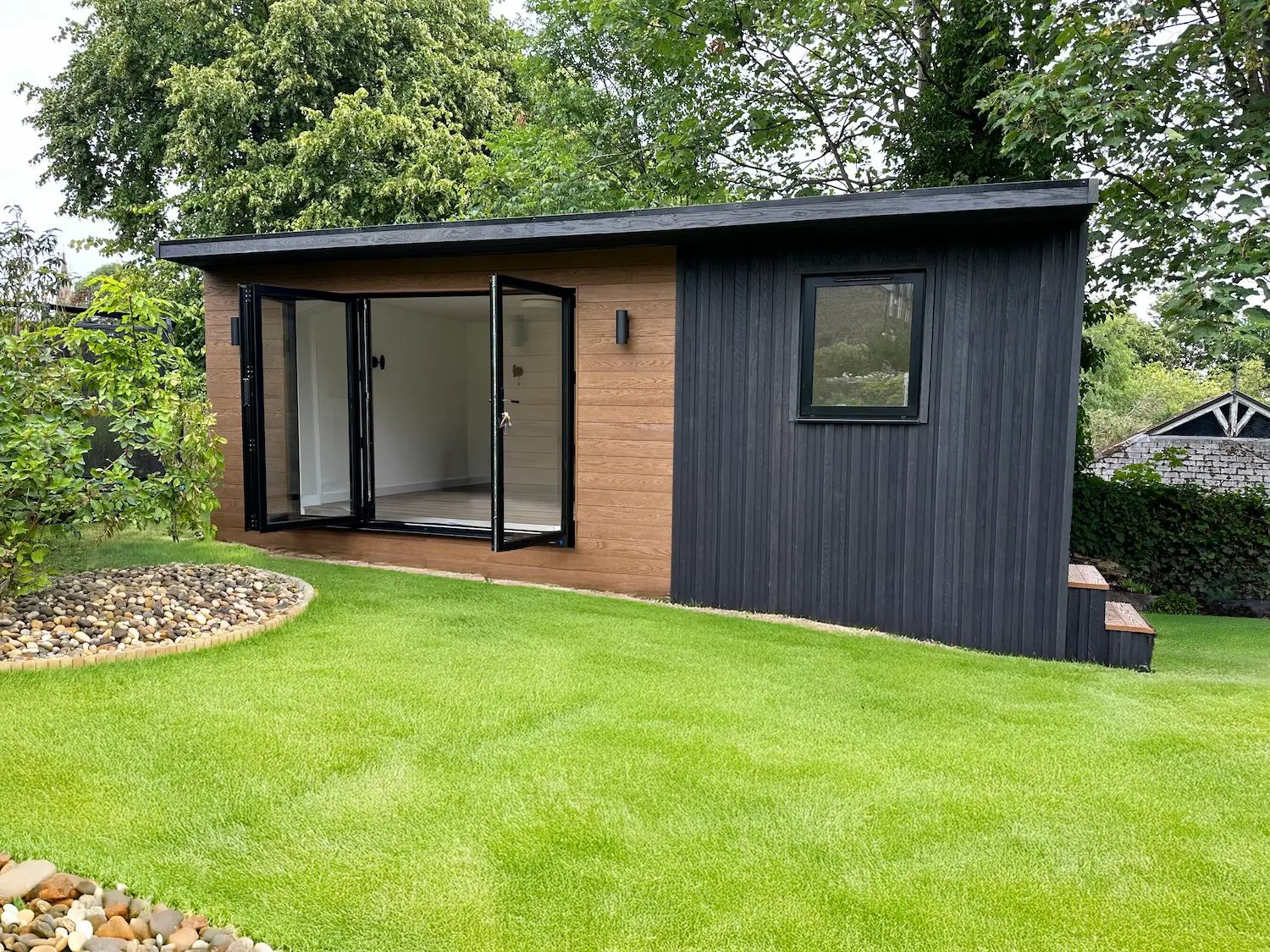 To the front and side elevations, we installed Millboard’s Batten and Board Cladding in Burnt Cedar. (Find Out More) This premium cladding replicates the character of charred timber, giving the annexe a rich, dramatic appearance without the maintenance issues of real wood.