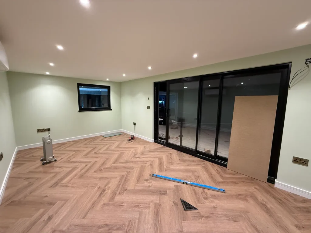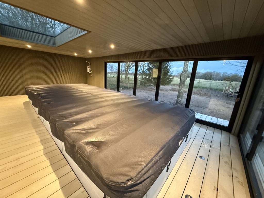 Beyond the office space, the couple wanted a relaxing outdoor retreat where they could enjoy their swim spa in all seasons. To achieve this, we designed a 7m x 3.5m garden room with an extended 8m x 5.8m canopy, offering ample shelter for the swim spa and an elegant outdoor area. To create an open, airy environment, we installed 5m bi-fold doors on both the front and left sides of the structure. When fully opened, these doors allow for a seamless transition between the indoor and outdoor spaces, enhancing the swim experience with fresh air and garden views.