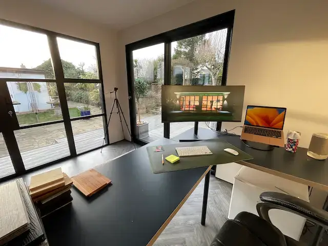 The show site Garden Studio is divided into two rooms. The first room is a garden office/chill-out room, which provides a peaceful and private space for work, reading, or simply relaxing. The room is bright and airy, with large windows that let in plenty of natural light.