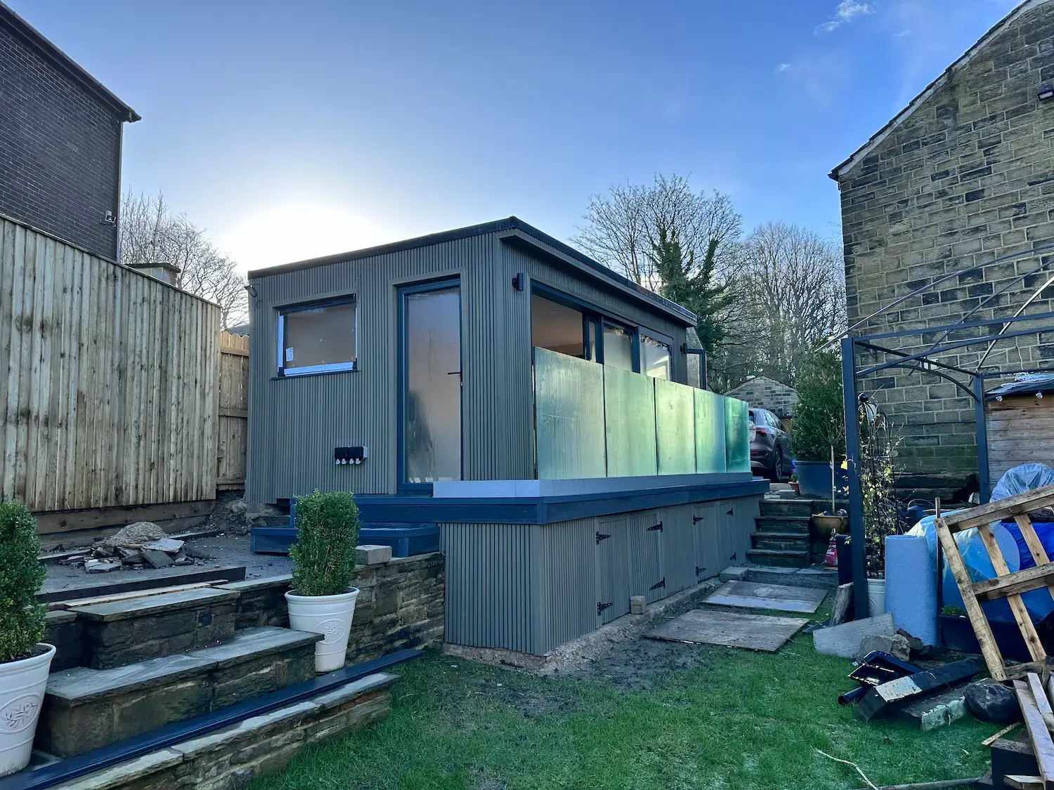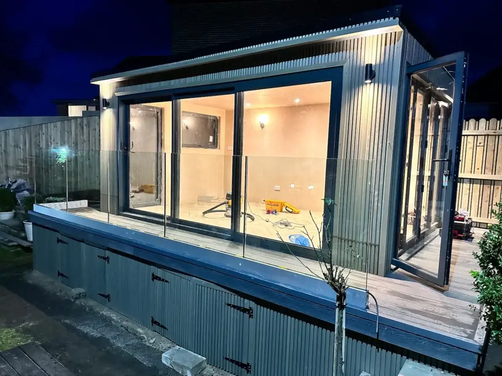 Working closely with them, we tackled the challenge of their elevated garage platform and the need for storage. The result? A breathtaking SIPS garden room, featuring glass doors on two sides, a glass balconette, and handy storage below.