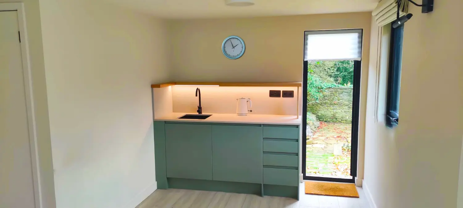 A fully integrated kitchenette with fridge, sink and storage, ideal for guest stays or light everyday use.