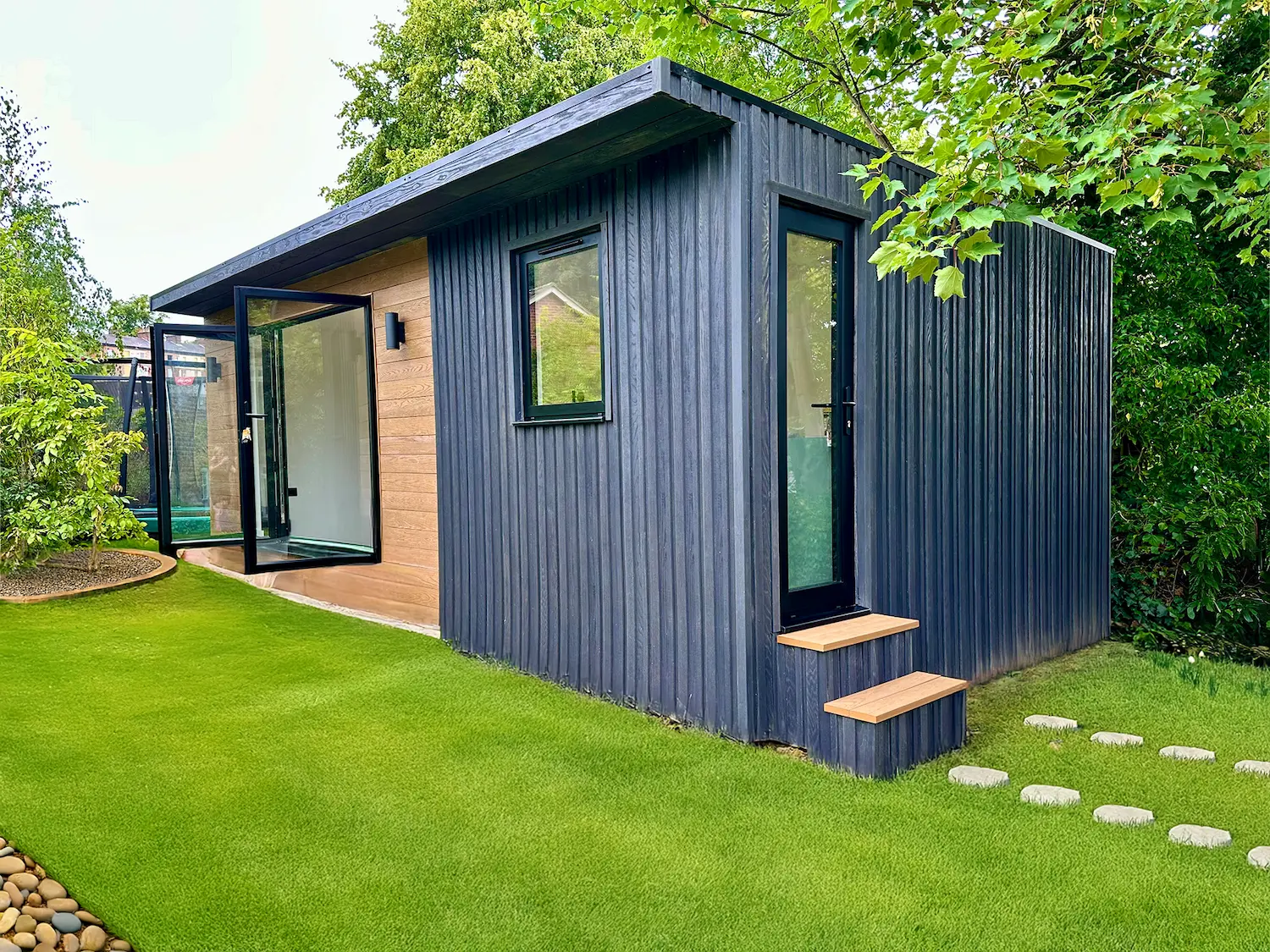 To the front and side elevations, we installed Millboard’s Batten and Board Cladding in Burnt Cedar(Find Out More) This premium cladding replicates the character of charred timber, giving the annexe a rich, dramatic appearance without the maintenance issues of real wood.