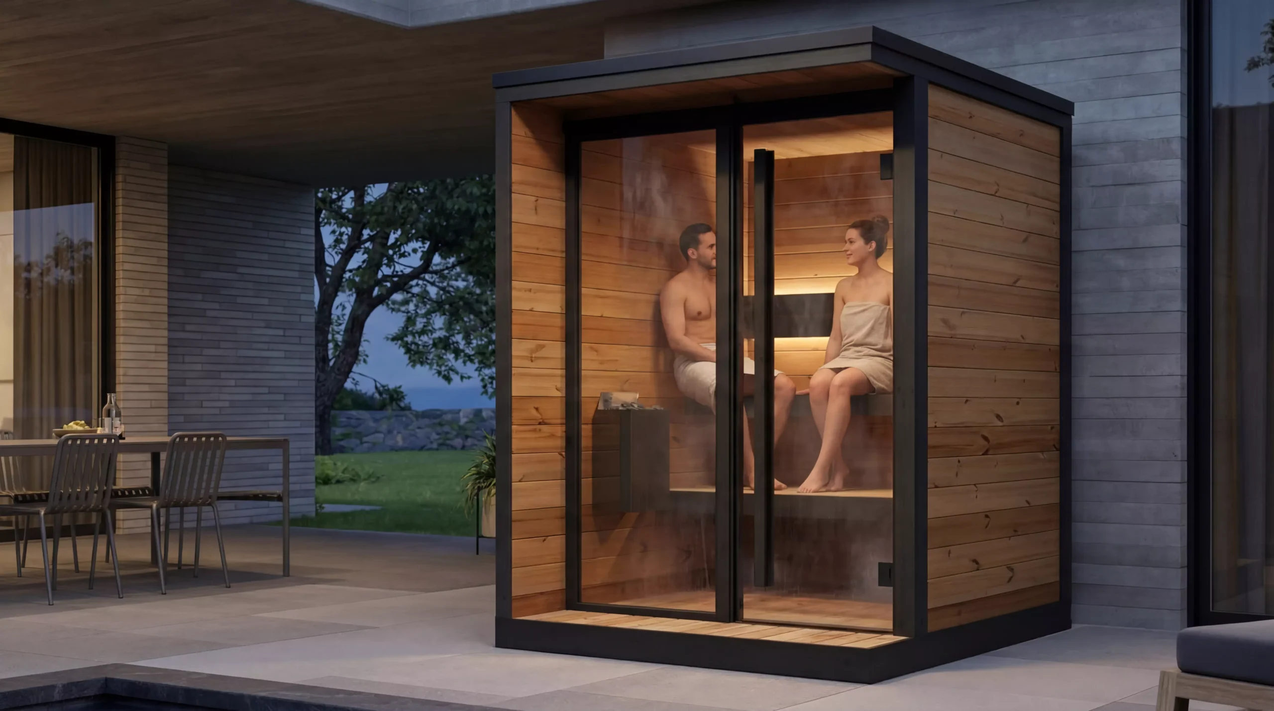 Heritage Sports outdoor sauna with 2 Person, thermally treated timber and panoramic glazing.